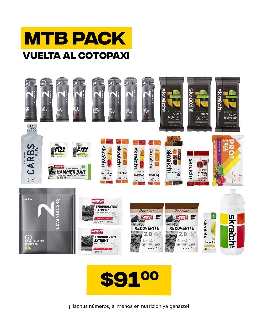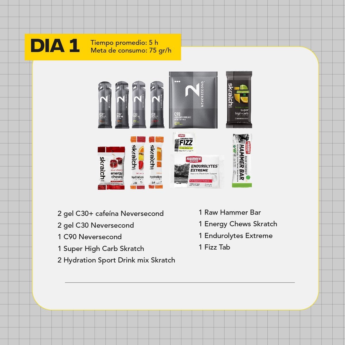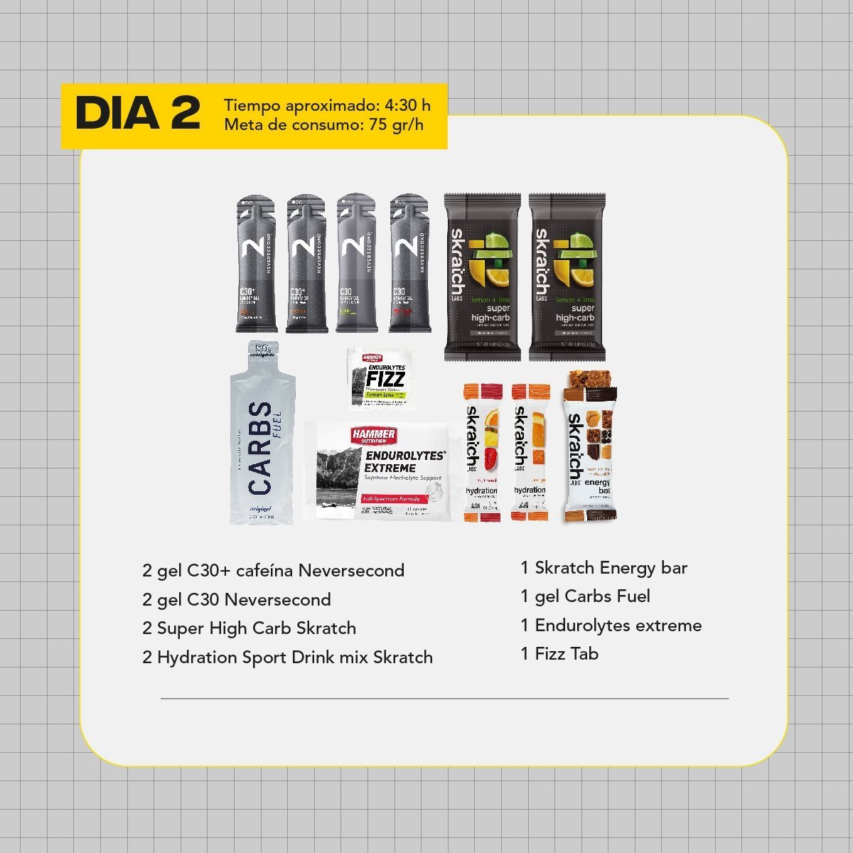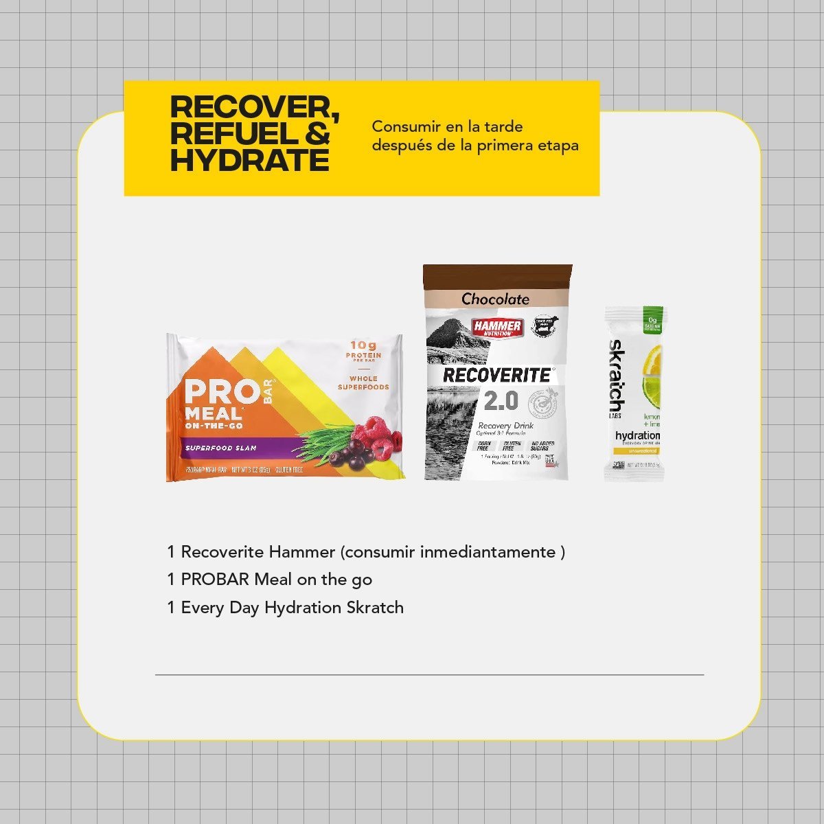 Pensando en 2 días de competencia en altura. Con energía e hidratación para los dos días y recovery con snacks para día intermedio y post carrera.
